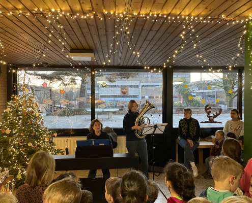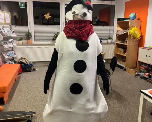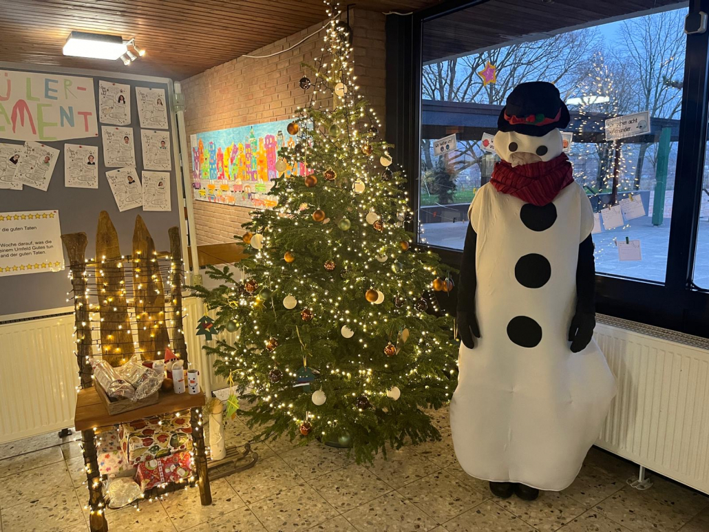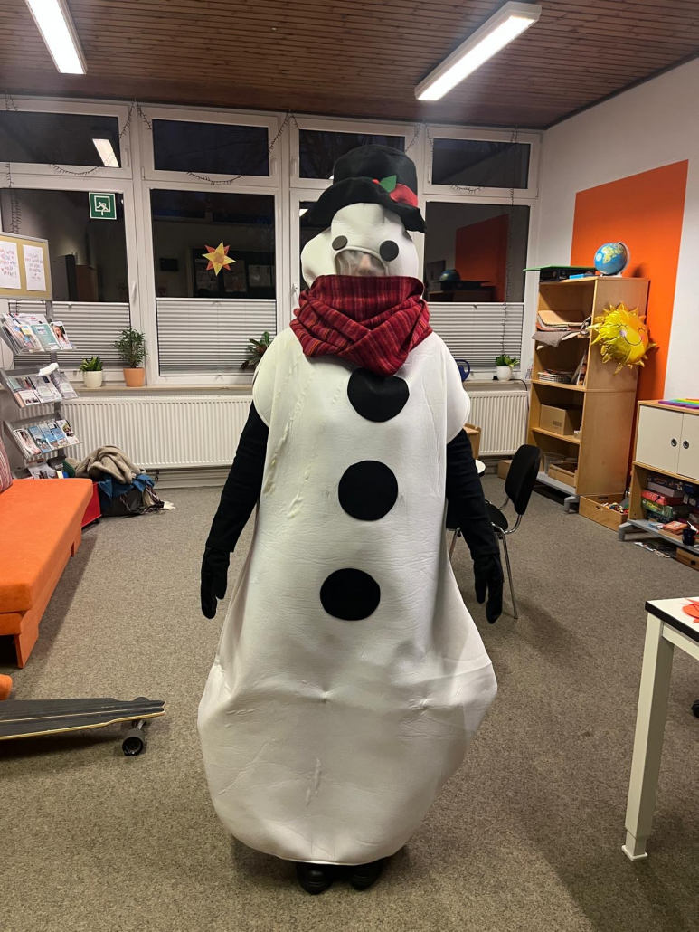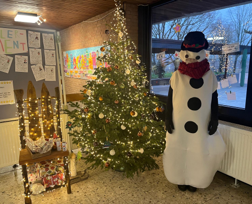 Am letzten Schultag vor den Weihnachtsferien gab es für alle Kinder eine kleine Überraschung: Ein Schneemann nahm ebenfalls am Adventssingen teil und besuchte anschließend die Kinder in den Klassen, um ihnen schöne Ferien zu wünschen.