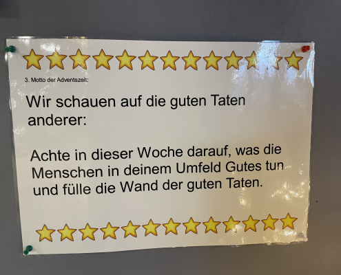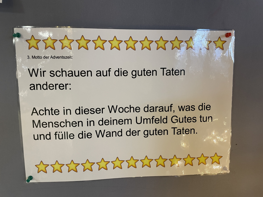 Das Motto der dritten Adventswoche lautet: „Wir schauen auf die guten Taten anderer: Achte in dieser Woche darauf, was die Menschen in deinem Umfeld Gutes tun und fülle die Wand der guten Taten.“