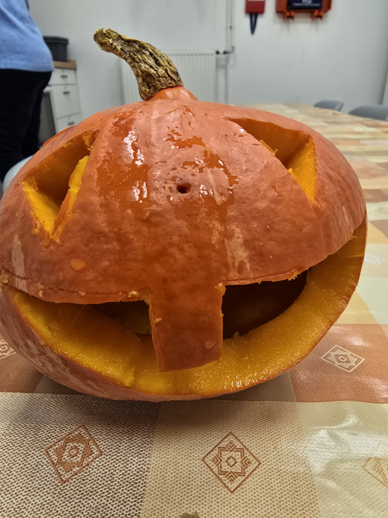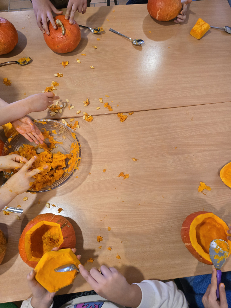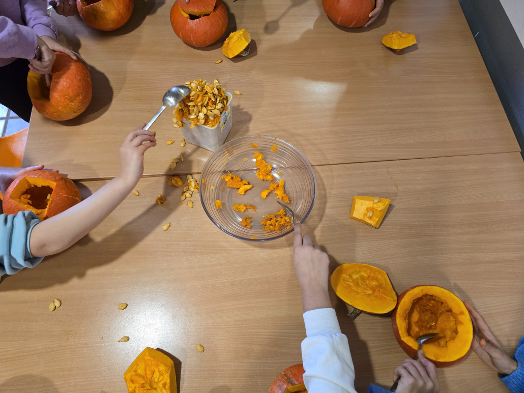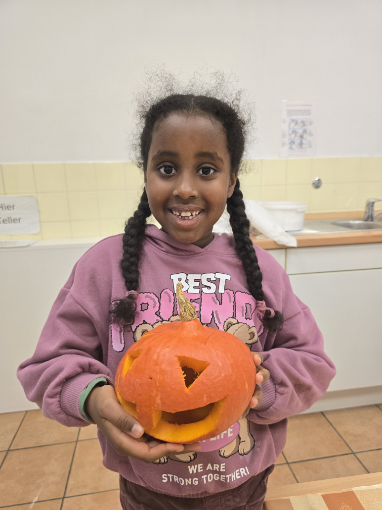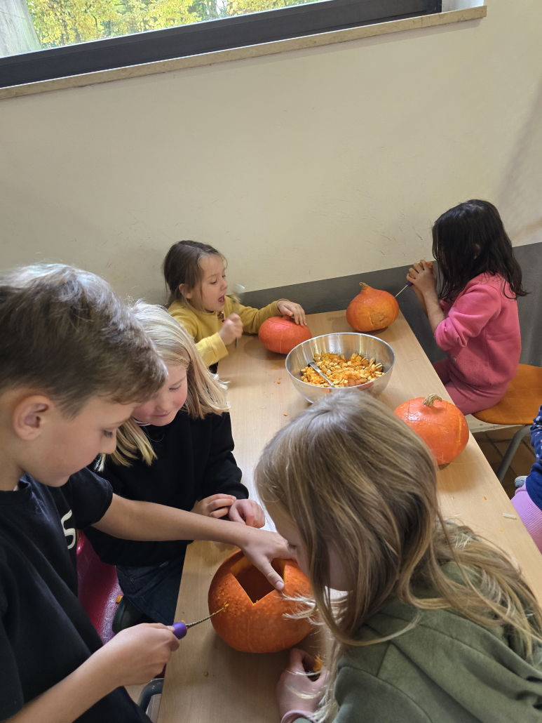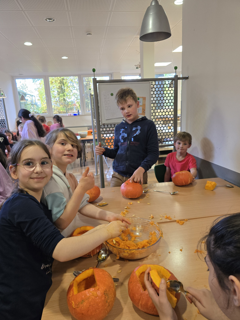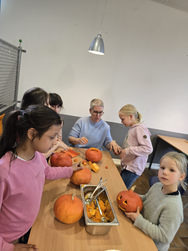 Am 30.10.2025 wurden in der Kunterbunt-AG im Ganztag Kürbisse ausgehöhlt und mit tollen Gesichtern versehen. Die Kinder aller Jahrgangsstufen schnitzten mit vereinten Kräften witzige und gruselige Grimassen in die Kürbisse. Unterstützt wurden sie dabei von den pädagogischen Mitarbeiterinnen Yvonne Förster-Dörenkämper, Tanja Bredol und Katrin Hewitt. Das Kürbisfleisch wurde dann von Yvonne Förster-Dörenkämper zu verschiedenen Kürbis-Leckereien für alle Schülerinnen und Schüler sowie Lehrkräfte verarbeitet.